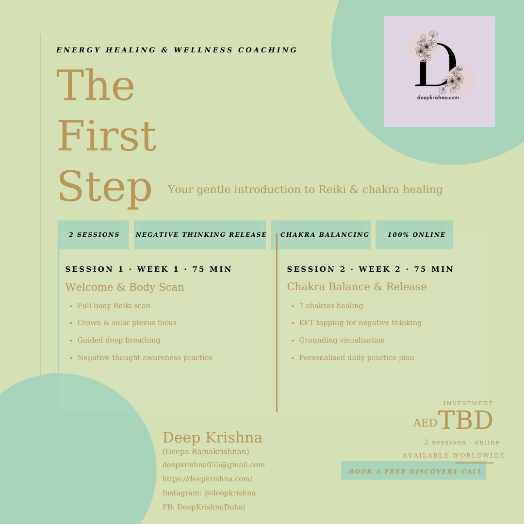 New to energy healing? The First Step is a gentle 2-session online programme to help you release negative thinking and begin healing your chakras — no experience needed, just an open mind.